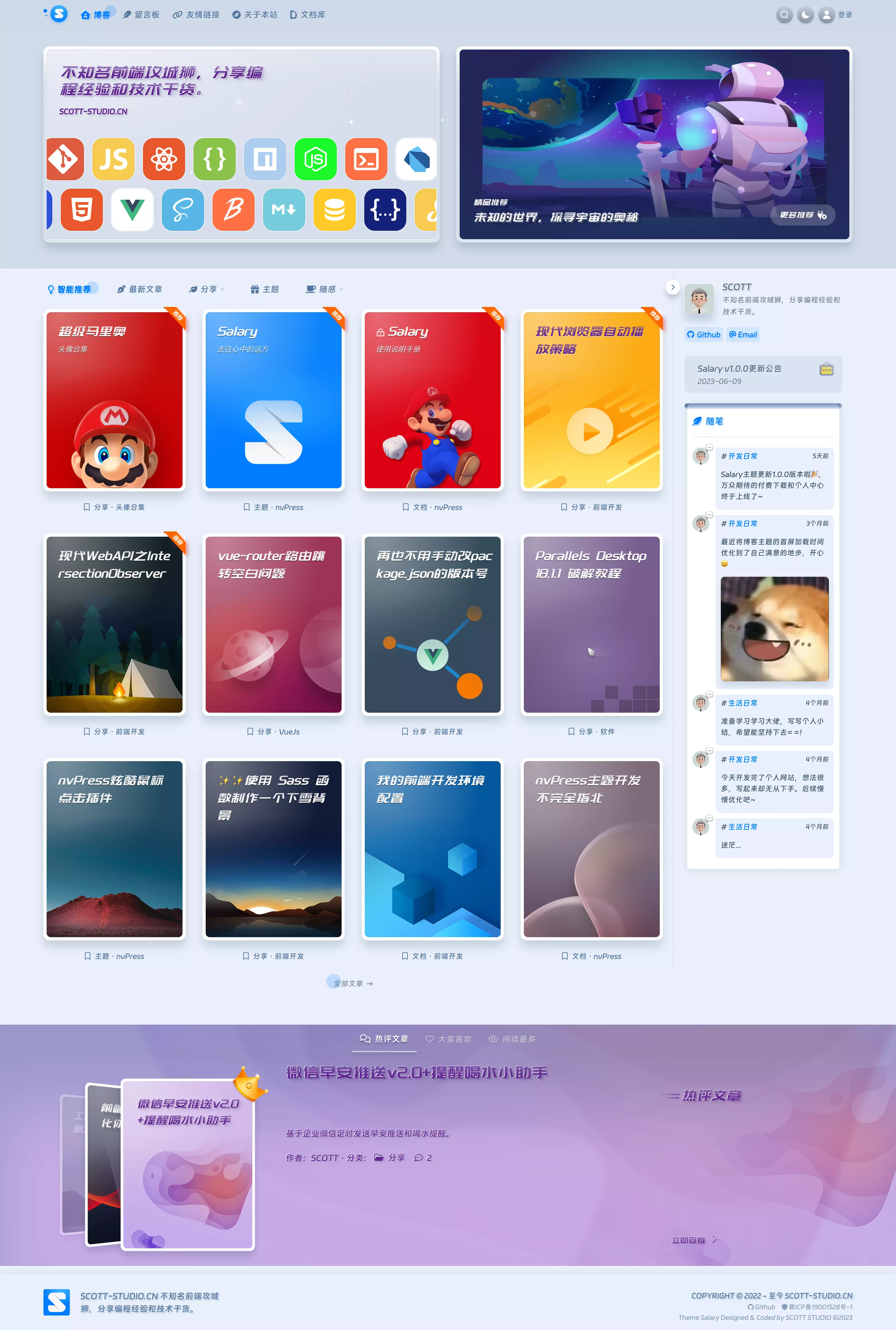 得益于nvPress的出现,开发主题不再需要像wordpress那样需要学习php,也不需要懂很多mysql的内容,完全由前端开发的Salary主题才能够问世。